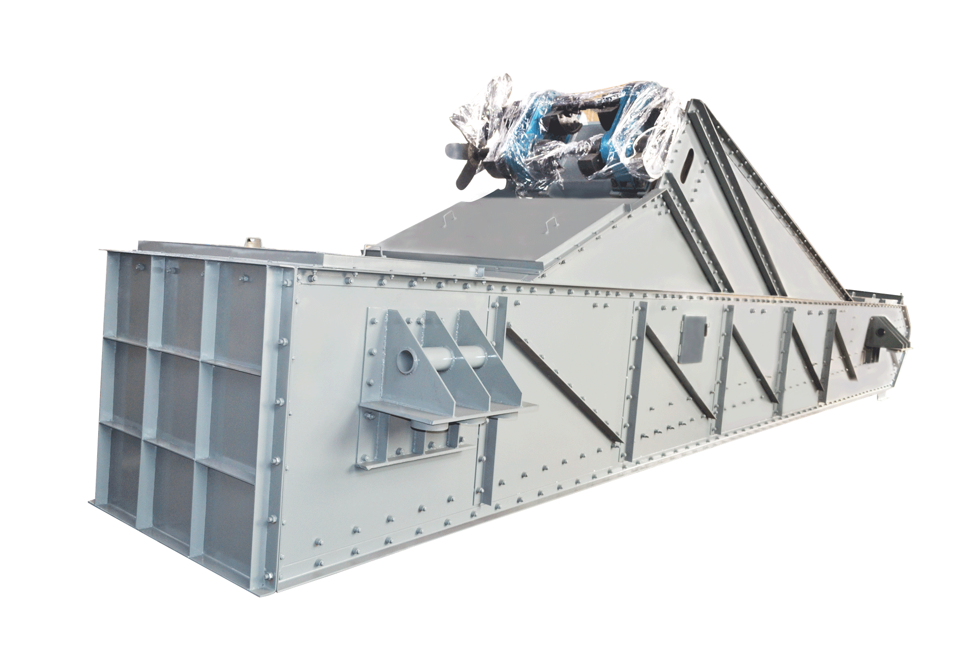 该系列筛主要有筛箱、筛网、振动器、减振弹簧装置、底架等组成。振动器安装在筛箱上,由电动机通过联轴器带动旋转,产生离心惯性力,迫使筛振动。